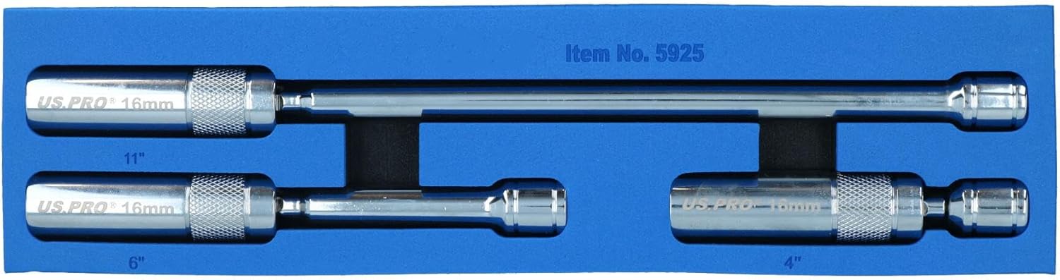 Professional spark plug sockets for commercial or occasional use 16mm thin walled spark plug sockets 3 different sized (length) spark plug sockets perfect for access in restricted hard to reach areas Thin walled sockets so perfect for limited room / access Three different length spark plug sockets to cater for different needs Manufactured from CR-v steel for maximum strength and durability Rubber inserts in the spark plugs to grip the spark plug and prevent damage to the item 12 point / bi-hex sockets 3/8in drive so will fit any 3/8in drive ratchets, extensions, bars etc... 360 degree swivel joint on the spark plug sockets Magnetic core to prevent the spark plugs from falling out Comes in an eva tray for easy storage and transport perfect for in draws in tool boxes 3 different length spark plug sockets 1. 1 x 16mm spark plug socket with 360 degree swivel – total length – 100mm (4 inches) 2. 1 x 16mm spark plug socket with 360 degree swivel – total length – 150mm (6 inches) 3. 1 x 16mm spark plug socket with 360 degree swivel – total length – 280mm (11 inches) SPECIFICATIONS Spark plug sockets Size – 16mm Length – 4 inches, 6 inches and 11 inches Drive size – 3/8in drive 12 point / Bi-hex sockets Magnetic core Thin walled 360 degree swivel joint Manufactured from CR-v HRC45 Complete in eva foam tray
