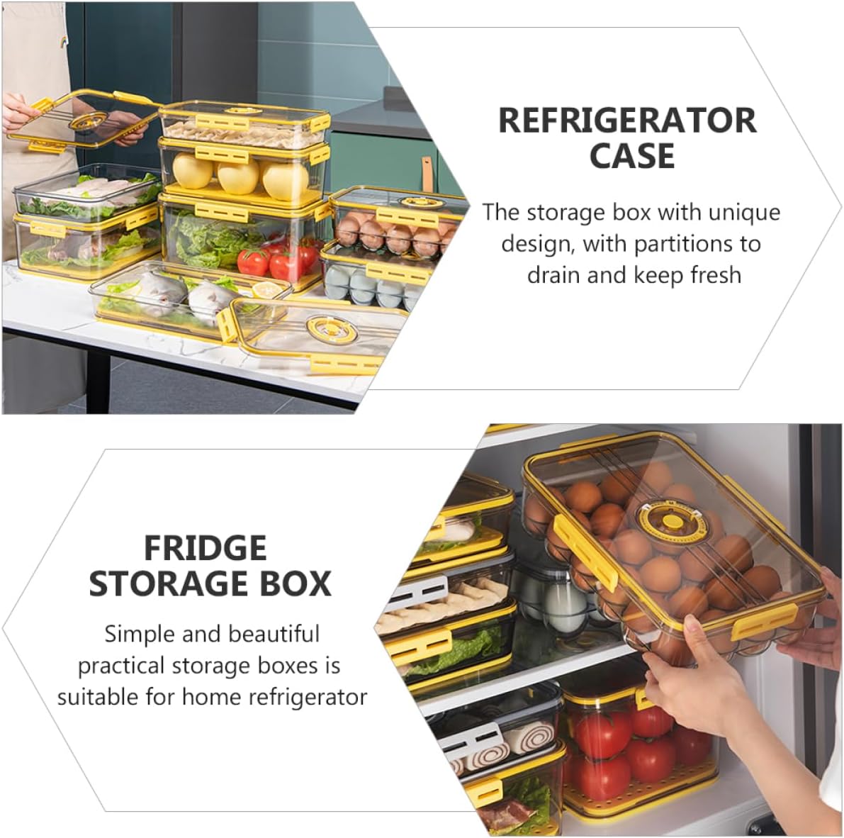 Package List 1 x fridge storage box with lid Features - Color: Transparent, yellow - Material: PET - Size: 32.50X22.50X15.30 cm/12.77X8.84X6.01inch - The unique sealing cover design, convenient to use, reliable and useful for keep fresh and isolate peculiar smell - This refrigerator storage box can make you freezer orderly and neat, convenient for storageGoods DescriptionThis transparent fridge storage box made from PET offers a simple yet effective solution for organizing your refrigerator. Its well-crafted design includes partitions that help separate fruits and vegetables while a secure lid maintains freshness and prevents spills. Sized at 32.5 by 22.5 by 15.3 cm, the container fits comfortably in most kitchen refrigerators, transforming cluttered shelves into tidy storage spaces. The material use, while the unique date display feature assists in managing food freshness. Whether storing produce or leftovers, this storage box contributes to neat and accessible fridge, improving your kitchen routine and experience. Its straightforward design and practical functionality make it helpful addition tony household aiming to enhance food storage efficiency From SHOWERORO was created to bring thoughtful organization and freshness to everyday kitchens. Inspired by need for practical storage solutions, our containers combine materials with functional design to simplify . Each storage box supports a cleaner fridge and fresher produce, helping families enjoy more pleasant cooking and dining moments. Organize your kitchen with SHOWERORO and experience simplicity that brightens daily life