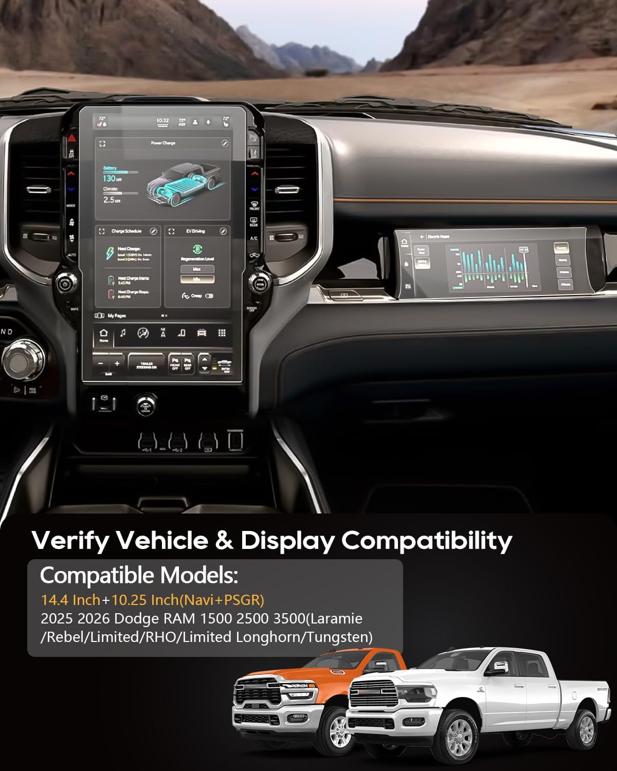 LFOTPP Car Screen Protector for 2025 2026 Dodge RAM 1500 2500 3500(Laramie/Rebel/Limited/RHO/Limited Longhorn/Tungsten)14.4 Inch+10.25 Inch(Navi+PSGR) Infotainment Touchscreen Protector The Touch Display Screen Protector Is Available on The Following Models: 1)2025 2026 Dodge RAM 1500 2500 3500(Laramie/Rebel/Limited/RHO/Limited Longhorn/Tungsten)14.4 Inch+10.25 Inch(Navi+PSGR) Car Navigation Screen Protector – HD Clear, Anti-Scratch, Perfect Fit Key Features: ★ 9H Tempered Glass — Scratch & impact resistant, shatterproof design ★ Ultra-HD Transparency — 99.9% clarity with zero distortion ★ Vehicle-Specific Fit — Laser-cut precision, bubble-free full coverage ★ Easy Installation — 3-step guide, automatic bubble elimination ★ Anti-Glare & Smudge Resistant — Clear view in sunlight, fewer fingerprints Benefits: · Protects against scratches, dust & fingerprints · Maintains screen clarity & touch sensitivity · Enhances driving safety with glare reduction