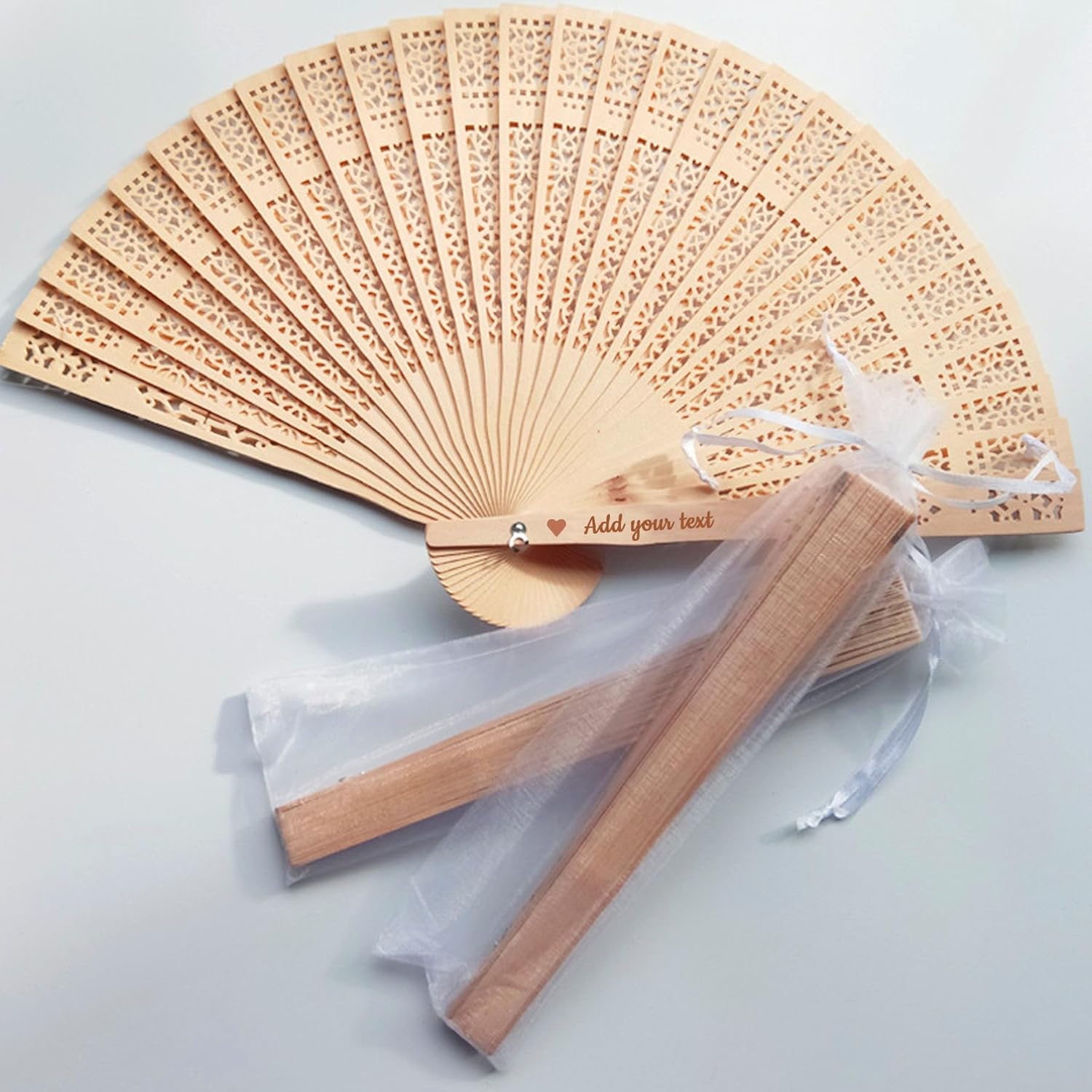 Custom unique wooden fan with Name/Text You can carve your name or a memorable date for you on the handle. Let you remember this happy moment every time you pick up this custom fan. If you will give the fan as a gift to your family and friends at the wedding, they will be very surprised and share the joy and happiness with you. Hollow carved design these wooden handheld fans adopt a hollow design, matched with wood color and white tassels, simple and classic, elegant and stylish, showing your elegant taste, and can keep you cool in the summer and decorate your home, office, tea house, stages, wedding party, birthday party, graduation ceremony, also as bridal dancing props, church wedding gift, party favors and so on you will get 1-100 pieces of wooden fans designed with a hollow pattern, and each folding fan is well protected with a white organza bag, sufficient quantity can meet your daily use and replacement, these exquisite fans are suitable for decoration in various important occasions