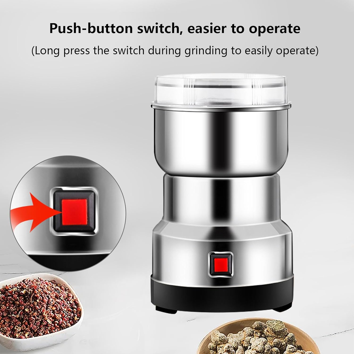 Specifications(about):Name: Coffee GrinderVoltage: AC110V/AC220VPower: 550WFrequency: 50HzMaterial: food-grade stainless steelSize: 170*105*105mm/6.69*4.13*4.13inPacking List: Electric Grain Grinder * 1Feature:1. Powerful electric coffee grinder. use a coffee grinder mainly for grinding herbs and spices. Was super efficient. Perfect product for what it does. This machine is very attractive, well constructed and compact as well as easy to use.2. This grinder is easier to clean than the old grinder, it is quick to grind, small in size, does not take up much space, and is easy to useNote: The product can only be wiped with a damp cloth, not washed with water. Please make sure the raw materials are dry before use. The more dry the materials, the better the grinding effect.