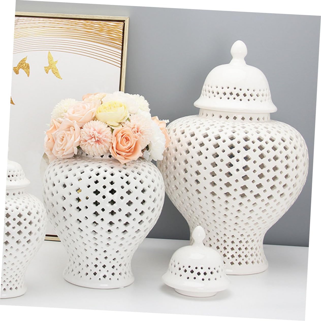 Package List 1 x hollow out jar Features -Color:White jars decorative -Material:Ceramic ceramic ginger jar -Size: 21.00X12.00X12.00cm/8.25X4.72X4.72in decorative jar with lid - Vintage hollow vase, is for porch, front door hollow vase balcony decoration ginger jar flower vase. - The hollow vase is widely used as wedding party hollow vase, elegant and full of romantic breath vase decor. - Small and lightweight, this ceramic flower Vase can be moved easily and conveniently ginger jar. - Ceramic Hollow jar also can be used as plants planter in your garden, for gardening use flower vase. - Hollow-out jar is made of ceramic materials, which is light and , not easy to break vases for decor.Goods Informationflower vase This hollow flower arrangement is made of ceramic material.decorative jar The special flower Vase is the suitable shape and size to create an eye-catching vibrant display of color and also look to place them in house or garden, balcony.decorative jar with lid Your home will be an attractive focal point, especially if you add flowers to them