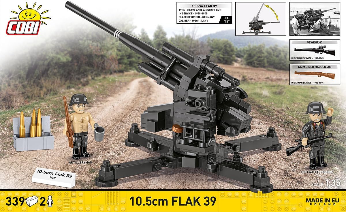 Build a model of the 10.5 cm Flak 39 anti-aircraft gun and display this heavy anti-aircraft artillery in a realistic brick-built version!There are constructions that don't need a legend, because they create one themselves. The 10.5 cm Flak 39 is an example of heavy anti-aircraft artillery designed with one goal in mind: effective defense against air threats. Its massive silhouette, technical complexity and uncompromising firepower made this gun one of the pillars of the German anti-aircraft defense system.This set brings history to the world of building blocks, offering a realistic model that focuses attention on the gun itself. This is a proposition for those who are looking for something more than just a model, for those who want to build a piece of history. 10.5 cm Flak 39, a weapon for combating targets at high altitudes! Work on the German 105 mm anti-aircraft gun began in 1933, when the development of aviation necessitated the creation of more effective weapons to combat targets at high altitudes. After testing designs developed by Krupp and Rheinmetall, the Rheinmetall design was adopted and received the designation 10.5 cm Flak 38.Soon, its modernized version, the 10.5 cm Flak 39, was created. It was equipped with an improved electric barrel rotation and elevation system and a system for transmitting data from the central fire control station. These solutions increased the precision and effectiveness of the firing, making the Flak 39 one of the most accurate weapons of the time. These were also among the most technically advanced anti-aircraft guns of their era. Due to their large size and weight, the 105 mm caliber cannons were not used by the ground forces. However, they found widespread use in the Luftwaffe, where they served in stationary, motorized and railway batteries.By the end of the war, approximately 1850 10.5 cm Flak 38 and 39 cannons remained in service, confirming their significant role in the heavy anti-aircraft defense system.Why is this set worth having?Heavy artillery in brick form - The 10.5 cm Flak 39 model attracts with its scale and massiveness, offering a completely different modeling and collecting experience than lighter artillery pieces.Ideally suited for display - The 1:35 scale allows the model to be displayed as a standalone object or as part of a larger historical diorama.It has movable parts - The rotating mount, adjustable barrel and refined mechanisms make the cannon look and "behave" like a real one. Building this model is not only the satisfaction of precisely assembling the bricks, but also an opportunity to learn more about the history and technology of the German forces during World War II.Figures included - Two artillerymen figures complement the scene, giving it life and emphasizing the combat function of the cannon. The soldiers are armed with Mauser 98K and Gewehr 43 rifles. One soldier is in a gray uniform with red patches and a characteristic German helmet. The other is an experienced front-line soldier in a helmet, with his uniform top removed for comfort while working at the gun, and with an ever-present smile. He's holding a cup of coffee in his hand... or maybe something stronger?It develops imagination and patience - Building this model is not only enjoyable but also trains concentration and manual skills.Satisfaction from building - The solid construction and clear instructions make assembling the model a pleasant, engaging process, from the first brick to the finished cannon. Once assembled, the model is perfect as a decoration for any history and military enthusiast.Highest quality prints - durable, abrasion-resistant and retaining sharpness even after intensive play.Collector's additions - The set includes a weapons crate and several pieces of ammunition for the cannon, as well as a white, brick-built plaque with the model name and scale. This is not only a functional element but also a great way to display the model at home, in the office or in the living room.Wide selection - check out other models from the HISTORICAL COLLECTION WWII series from COBI and create your own collection of combat machines from that period. The 10.5 cm Flak 39 is a testament to an era where technology and scale were crucial. This set allows you to get closer to the realities of heavy anti-aircraft defense and build a model that impresses with its form and presence. If you are looking for a construction that stands out with its size, detail, and historical context, this cannon is the choice for you!