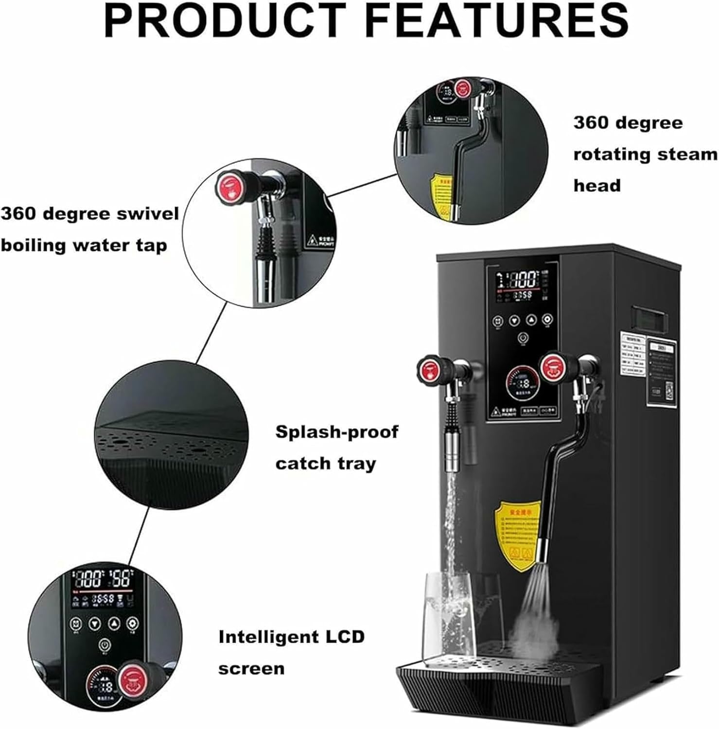 Is your coffee shop still using ordinary milk frothers?Our powerful steam milk frother can frother dense milk foam in 10 seconds, with large-capacity stainless steel milk tank, fast heating, and continuous cupping without pressure!Don't hesitate, place an order now!Features:*Intelligent LCD screen*Temperature display*Self relieving nozzle*3000 W high-power*304 inner liner*12L capacity*Body thickening*Multiple protection systemsSpecifications:Product name: Commercial steam milk frotherProduct model: -12LVoltage frequency: 220V/50HZSteam pressure: 0.1-4.0barRated power: 2500wInner tank material: 304 stainless steelApplicable water pressure: 0.1-0.4MPAWaterproof grade: IPX3Product color: Black, white, silverProduct size: 268*455*648mmPackage Included:1x Steam Water Boiling MachineNotes1.For a better milk foam effect, it is recommended to insert the steam nozzle into a milk cup about 1-2 cm.2.For the first time, it is recommended to add water to boil and clean before use.3.Please allow the slight color difference caused by the shooting light and 1-3 cm error due to manual measurement