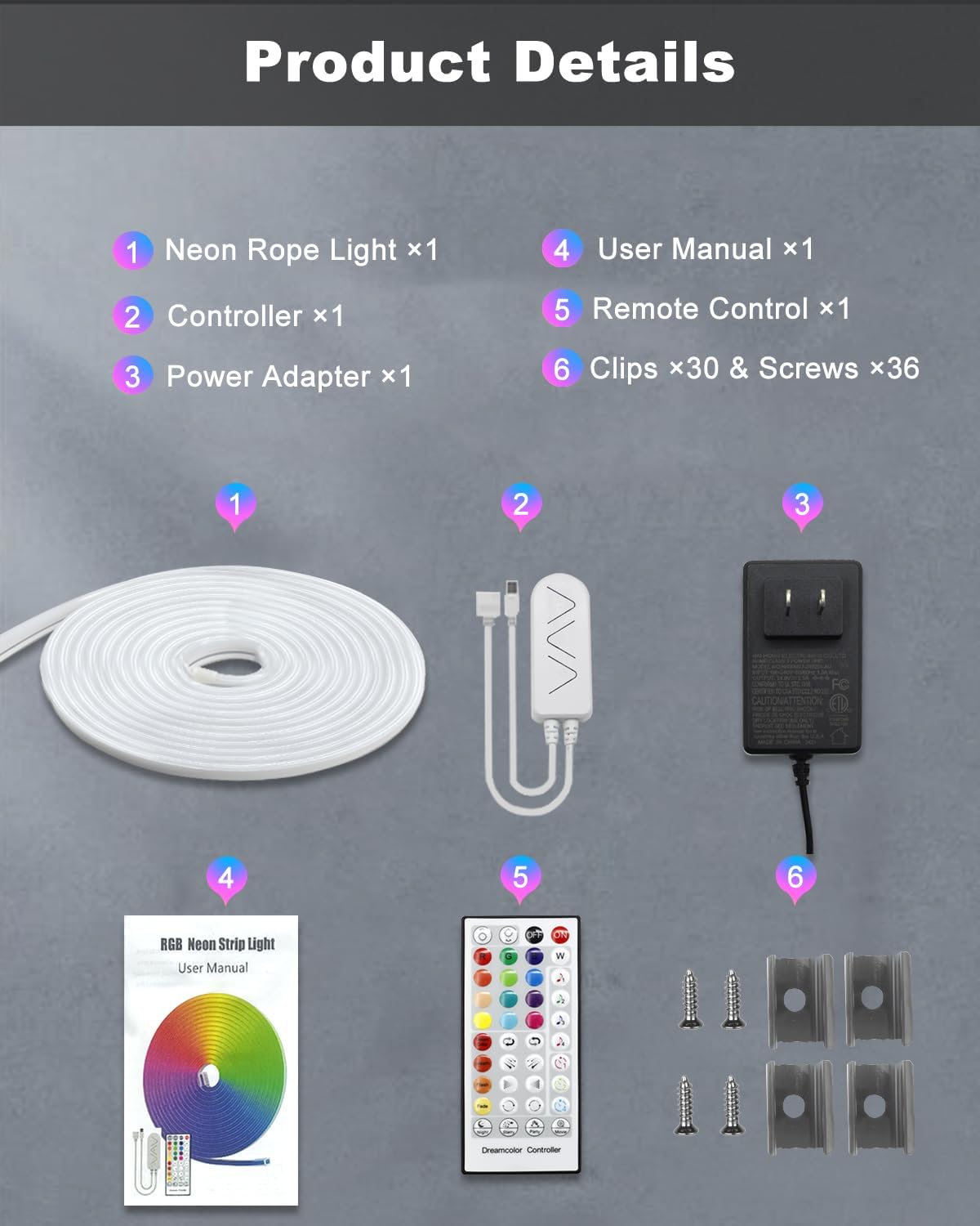 | Included Components | Clip*30, Instructions*1, RGB Neon Rope Lights*1, Remote*1, Screw*36 |
