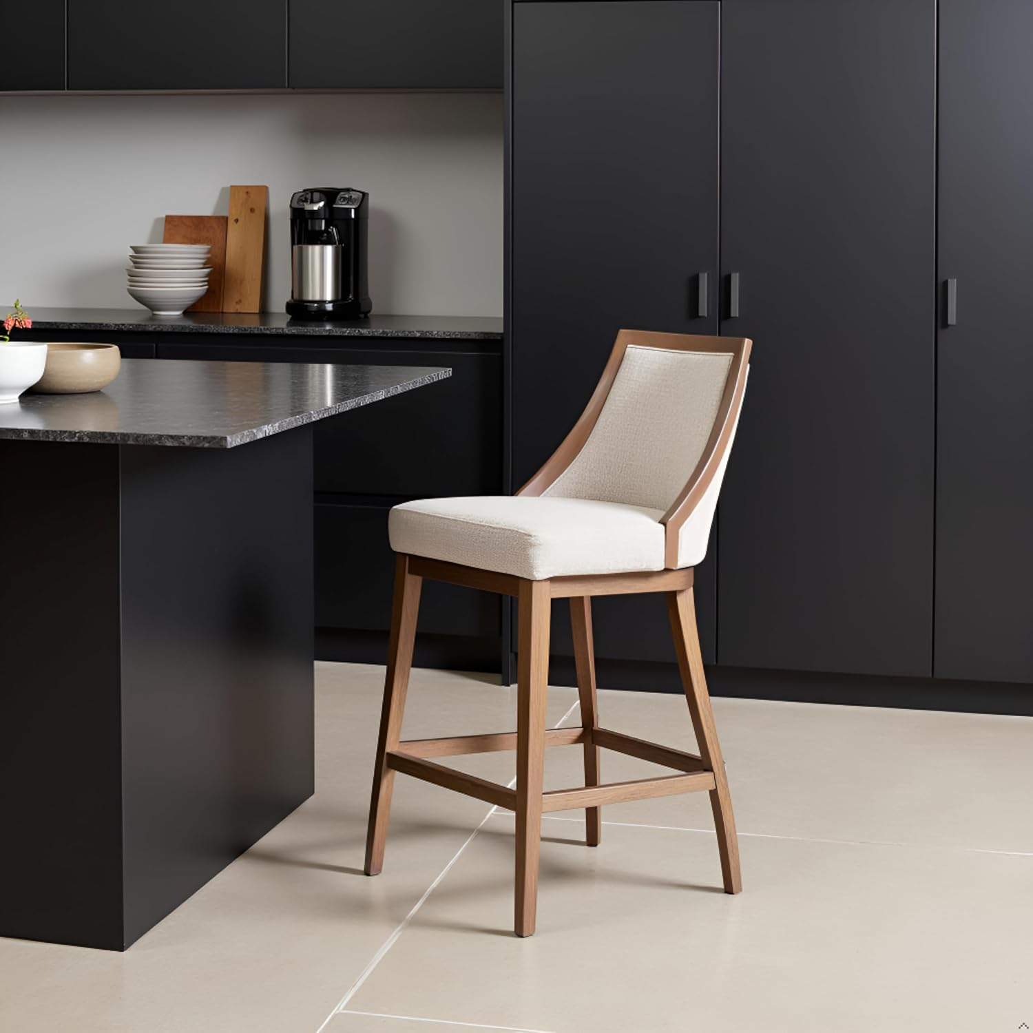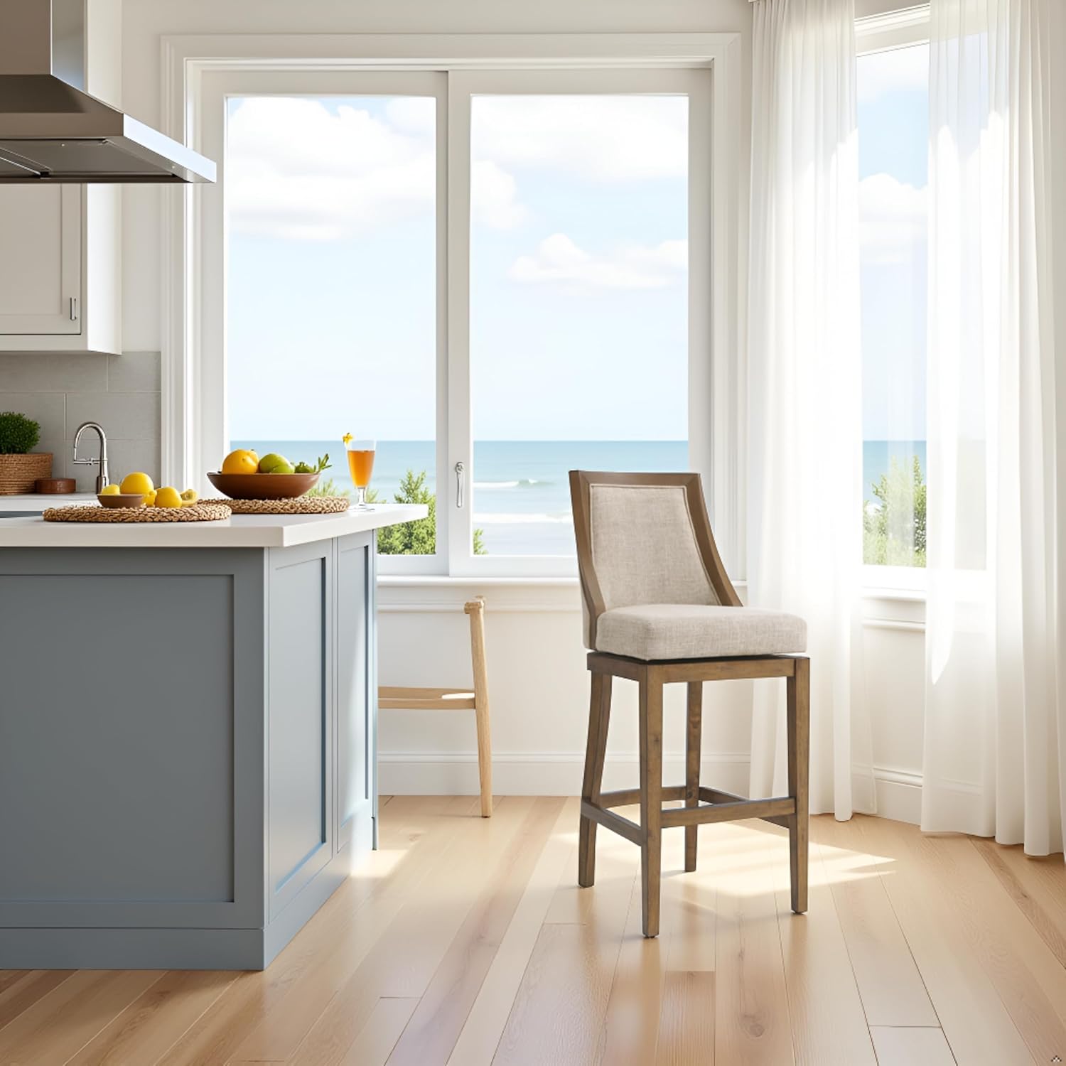 Add a touch of refined comfort to your kitchen or bar area with the Ellie Bar Height Swivel Stool. Crafted for both style and function, this space-efficient bar stool features a steel memory return swivel that smoothly rotates and automatically returns to its original position—ideal for dynamic seating around kitchen islands, pub tables, or apartment dining bars. The seat and back are upholstered in a beige, linen-like 100% polyester fabric, offering soft, cushioned support that blends beautifully into modern, transitional, or farmhouse interiors. A built-in footrest sits at a comfortable 10.5-inch height from the floor, while the metal kick plate adds durability and protection from everyday scuffs. Built from solid rubberwood with a warm brown finish, this bar-height stool supports up to 300 lbs, offering long-lasting structure in a space-saving design. Whether you're furnishing a compact kitchen, an urban loft, or a cozy breakfast bar, the Ellie stool delivers elevated style in a small-footprint form. Simple assembly required and spot clean with a damp cloth.