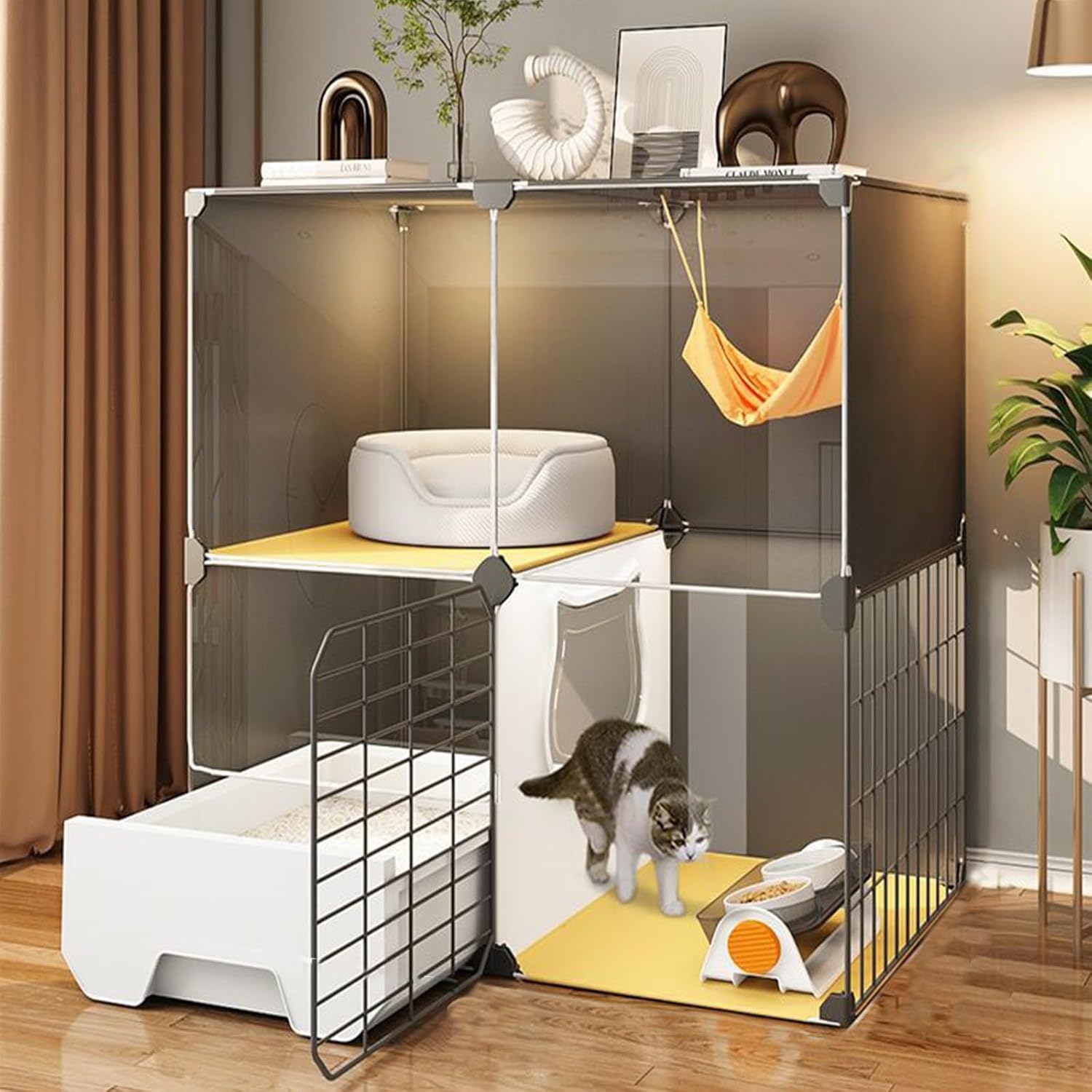 Introducing the Cat Cage Indoor with Cat Litter Box - the perfect solution for all cat owners seeking a comfortable and stress-free environment for their beloved feline friends. This innovative and thoughtfully designed cat cage offers a range of features that will enhance both your cat's well-being and your home's cleanliness. Crafted using an advanced injection molding process, this cat cage is built to be more solid than other assembled types of cat cages on the market. We understand that your cat's protection and security are of utmost importance, which is why this cat cage has been constructed with high-quality materials to ensure its long-lasting durability. Product name: DIY Cat Cage Material: PP+ Iron Size: (The size is as shown in the picture) 72*37*72CM , 72*47*72CM , 72*47*72CM-1 , 72*47*107CM , 72*47*107CM-1 , 107*47*72CM , 107*47*72CM-1 , 107*47*107CM , 107*47*107CM-1 Package A: Cat litter box, cat litter scoop Package B: Cat litter box, cat litter scoop, ladder, cat nest, cat bowl Assembly required: Yes Package includes: Cat cage*1 Package A/B*1 Please note: 1. While we display the most accurate color possible, there are likely to be variations in color due to differences in computer monitors. 2. Manual measurement, the size of the product will be 1-3 cm error.