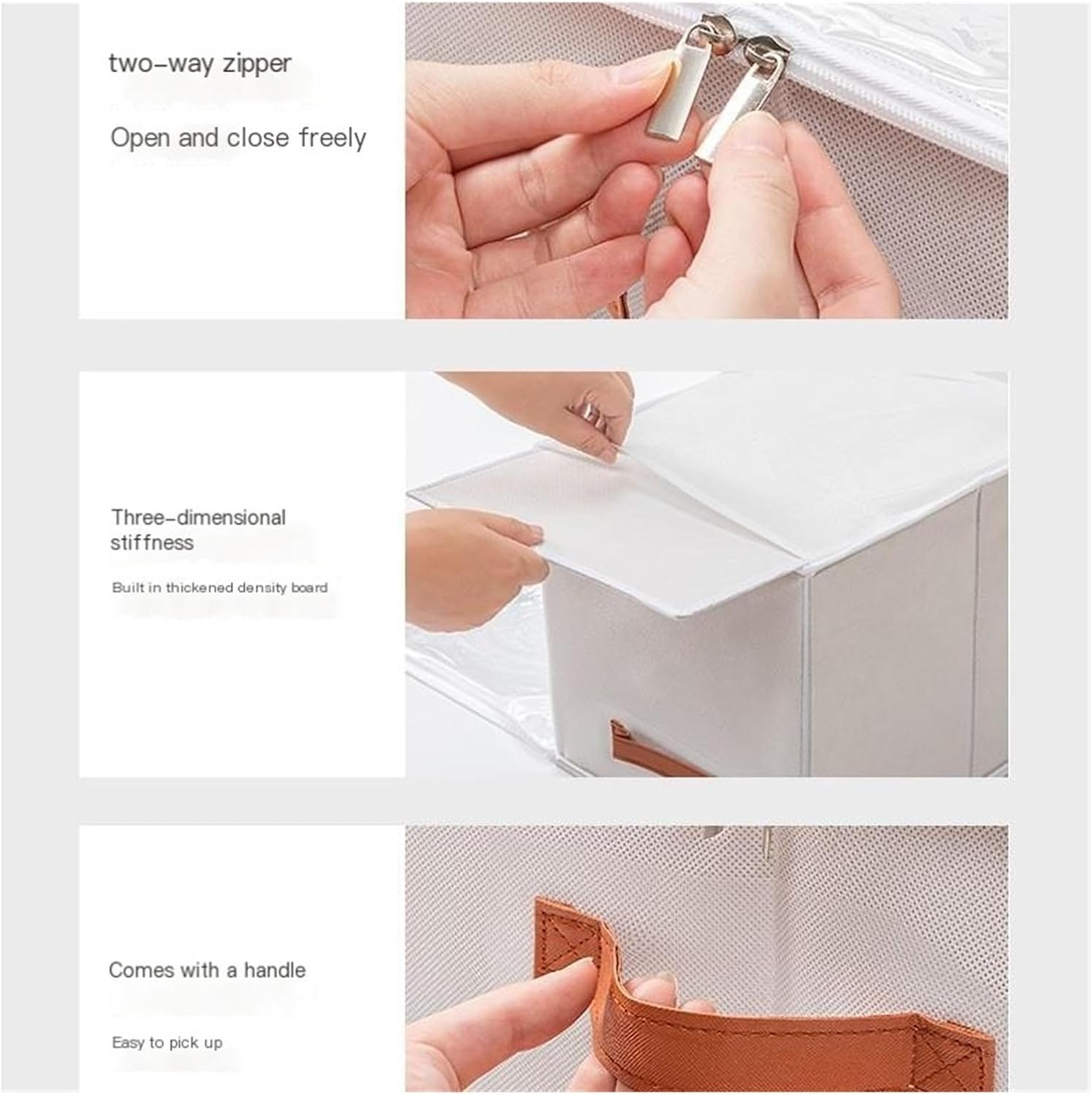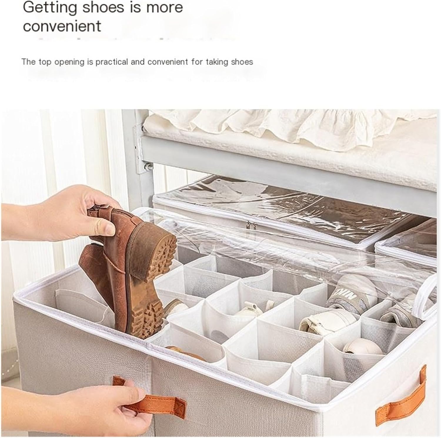 Transparent cover storage shoe box, life is so simple, born for the love of shoes, can be stored freelyLarge opening makes it easier to open and close shoes, and the top opening is practical and convenient for taking shoesFolding storage for easy placement without taking up space, saving space and making storage more tidy and orderlyThe handle design is smooth to pull and has a built-in handle for easy access and movement, making it more portableNOTED:Due to the different monitors and light effects, the actual color of the item might be slightly different from the color showed on the pictures. THANKS!Please allow 1-2cm measuring deviation due to manual measurement.==========Product Name: Shoe Storage BoxProduct Highlights: Free storage, FoldableMain material: non-woven fabricProduct weight:12 grids: 840g16 grids: 1089g20 grids: 1249gProduct packaging size: 12 compartments: 35cm * 35cm * 5cm 16 compartments: 40cm * 35cm * 6cm 20 compartments: 40cm * 35cm * 7cmProduct Colors: White/Light GreyPackage included: 1 storage boxOrigin : Mainland China