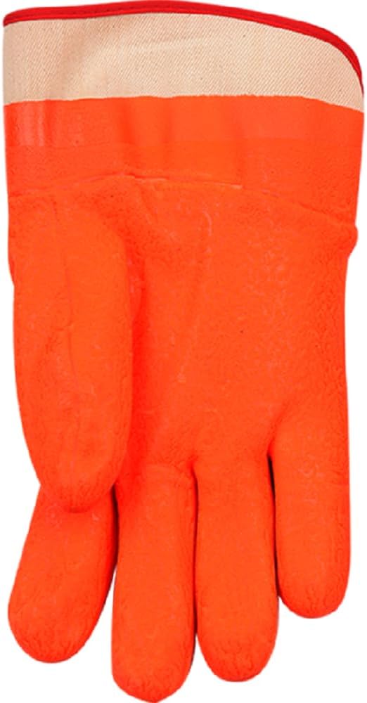Experience ultimate warmth and protection with these lined hi-vis orange sandy finish pvc gloves, specially crafted for cold environments and caustic chemicals. These gloves ensure your hands stay safe while handling greases, oils, solvents, and chemicals. A rubberized safety cuff and a PVC coating provide a secure grip and hand and forearm protection. The hi-vis orange color adds visibility in high-risk work zones, and enjoys comfort with the thermal cotton fleece and foam lining. These gloves provide the perfect combination of comfort and safety. Ideal for cold storage, irrigation and pipe, snow and ice removal.