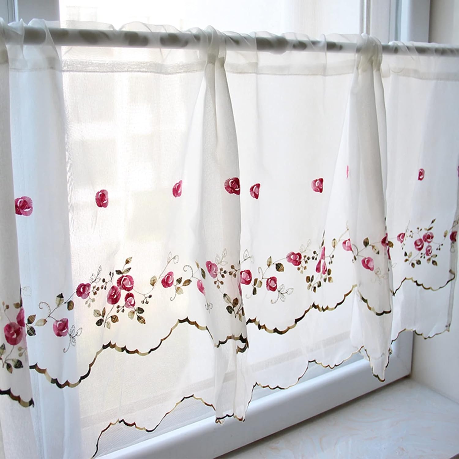 ♥ Pretty embroidered flower accents make dull windows look pretty and give your room a glam look.♥ The double-layered design gives your windows more layers and lets the light just right, not only allowing you to enjoy the beauty and brilliance of the sun, but also protecting your privacy.♥ The fabric is soft and light, giving it an elegant and light feel. ideal for kitchens, children's rooms, etc. mainly for decoration.♥ Specifications* Product Name: Embroidered Half Curtain* Color: White* Material: Polyester* Size (WxH): W145xH45cm/57x17.7in , W145xH58cm/57x22.8in , W145xH83cm/57x32.6in , W175xH45cm/68.8x17.7in , W175xH58cm/68.8x22.8in , W175xH83cm/68.8x32.6in , W230xH45cm/90.5x17.7in , W230xH58cm/90.5x22.8in , W230xH83cm/90.5x32.6in* Use place: Cabinet, Window, Cupboard, Interior door.* Installation: Rod access* Care instructions: Machine washable at 30℃ or below* The package includes: 1 short curtain (not including the rod)♥ Tips1. The price is for 1 piece of curtain. The size is the size of 1 piece of curtain2. the fabric has natural elasticity, handmade products size error bottom 2cm is normal.3. For proper padding, the panel should be 1.5 to 2.5 times the width of your window (for example: if you have a 100cm wide window, we suggest you buy 200cm.)