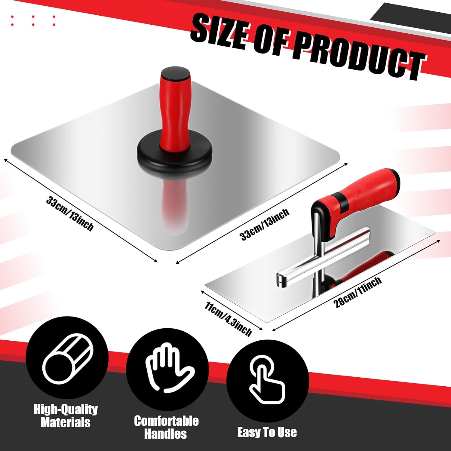 Features: Easy to Use: This tool set is light and easy to use, even for beginners. The mud hawk board holder handle can be easily installed and removed by rotating, which is convenient for cleaning and storage. Specifications: Material: Drywall trowel: stainless steel Mortar board holder: aluminum Handle: plastic Color: stainless steel color Size: Masonry hawk: 13 x 13 inches/ 33 x 33cm Finishing flat trowel: 11 x 4 inches/ 28 x 11 cm Package includes: 1 x Hand plastering trowel 1 x Concrete hawk Warm notes: Manual measurement, please allow slight errors on size. The color may exist a slight difference due to different screen displays.