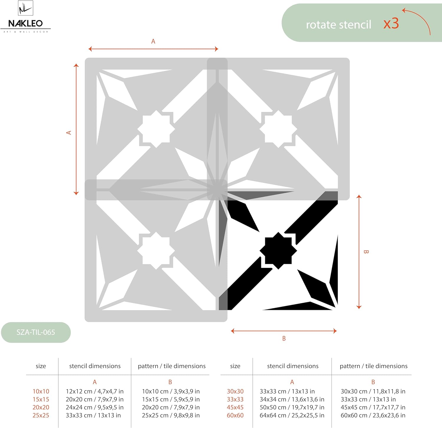 Collection Nakleo Tile Stencils is a series of painting stencils that imitate patterns found on ceramic tiles. Concrete stencils are made of strong, flexible and durable plastic - they can be used repeatedly to easily cover even the large surfaces at a low cost. With patio stencil patterns available in eight sizes, from 3,9”x3,9” to 23,6”x23,6”, they can be easily customized to fit most individual needs.Tile painting templates will let you create unique and unusual interiors on your own. With Nakleo floor stencils for concrete you can give new life to old bathroom tiles, kitchen tiles, balcony tiles, terrace tiles or garden slab. You can also paint walls, paving stones, concrete or wooden floors and other flat surfaces. This is much easier and cheaper than removing tiles, which always requires specialized tools, knowledge and consumes more time. The large stencils are available in eight sizes, adapted to the most popular dimensions of ceramic tiles. Motifs inspired by classic Spanish ornaments, Moroccan tradition, ethnic and Chinese patterns, geometric minimalism, modernist style, luxury or perhaps classic retro are just some of the diverse designs of this series. If you are looking for a variety of interior and decorating inspiration, just browse through our products and find your style!
