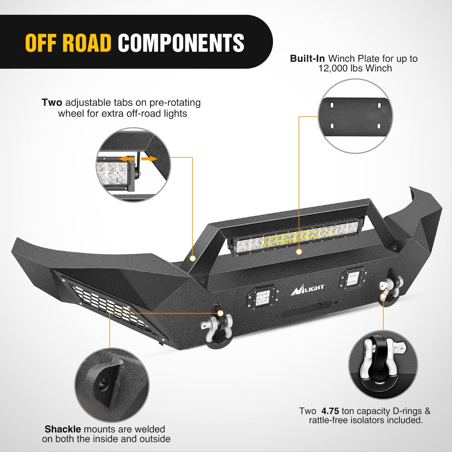• Everything You Need: Our package includes 1X Front Bumper, 2 x 18W LED Lights, 1X120W Light Bar, 2Pcs 4.75ton D-ring isolator for free, 1 x Set of Screws, 1 x DIY Installation Manual, 2 Years Nilight and Lifetime Best Customer Service. The packaging is specially designed and tested to avoid your package being damaged during transportation