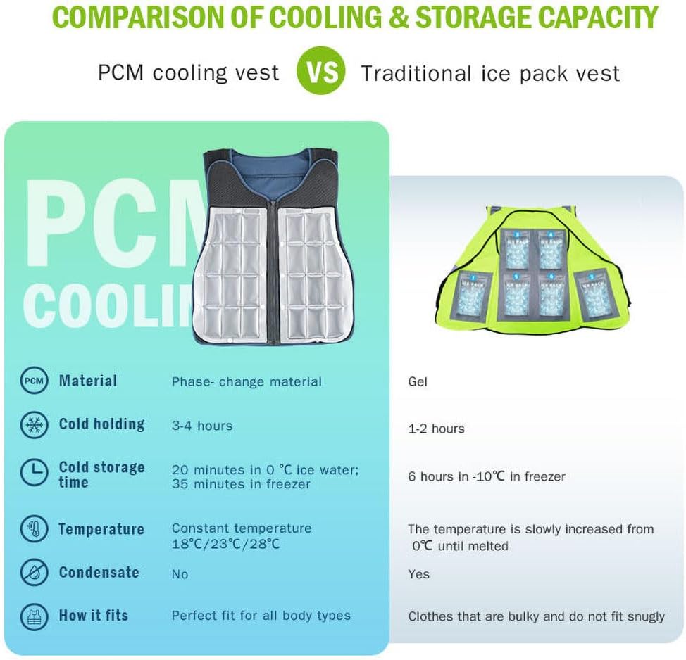 Phase Change Material Cooling Vest for Men Women, Universal Adjustable Cooling Cold VestPhase change coolant and polyurethane film are biodegradable, Phase change material is able to absorb a significant amount of heat energy during phase transition, which is a typical cooling source of passive cooling clothing. It can form a relatively constant temperature microclimate around the clothing according to the change of ambient temperature, realize the temperature adjustment and thus achieve the cooling effect. A cooling vest is to reduce the body temperature, relieve heat and fatigue.