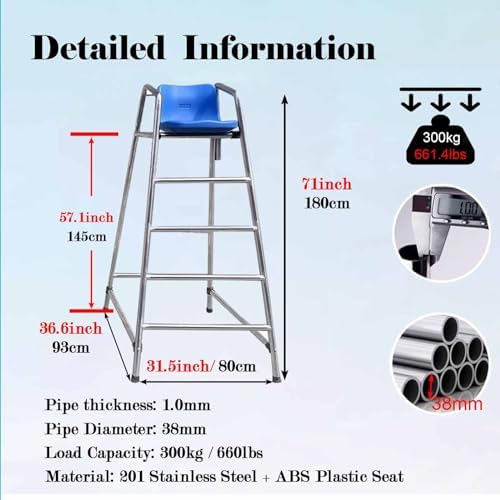 Description: Lifeguard chair is one of the safety facilities in swimming pool. The lifeguard sitting on it can overlook the whole pool and have a better view of the swimming area. Specification: Material: 201 Stainless Steel + ABS Plastic Load Capacity: 300kg/ 660lbs Pipe thickness: 1 mm Pipe Diameter: 38 mm Seat Size: 41x32x30 cm/ 16x12.6x11.8 inch Features: 201 stainless steel is strong and durable, can withstand 300kg/661.4lbs. ABS base is strong and stable, not easy to deform and crack, and comfortable to sit on. Backboard support at the bottom of the seat, more stable and safer. Side hooks for hanging life preservers, able to swivel 180°. Sunshade fixing holes are welded on the side for easy installation of sunshade and telescopic poles. Package Included: 1 x Lifeguard Chair ( Other items shown in the picture are not included ) Note: There may be some differences between the picture and the product due to display and lighting, please refer to the actual product. Because it is processed by hand, the finished product usually has an error of 1-2 cm, please understand.