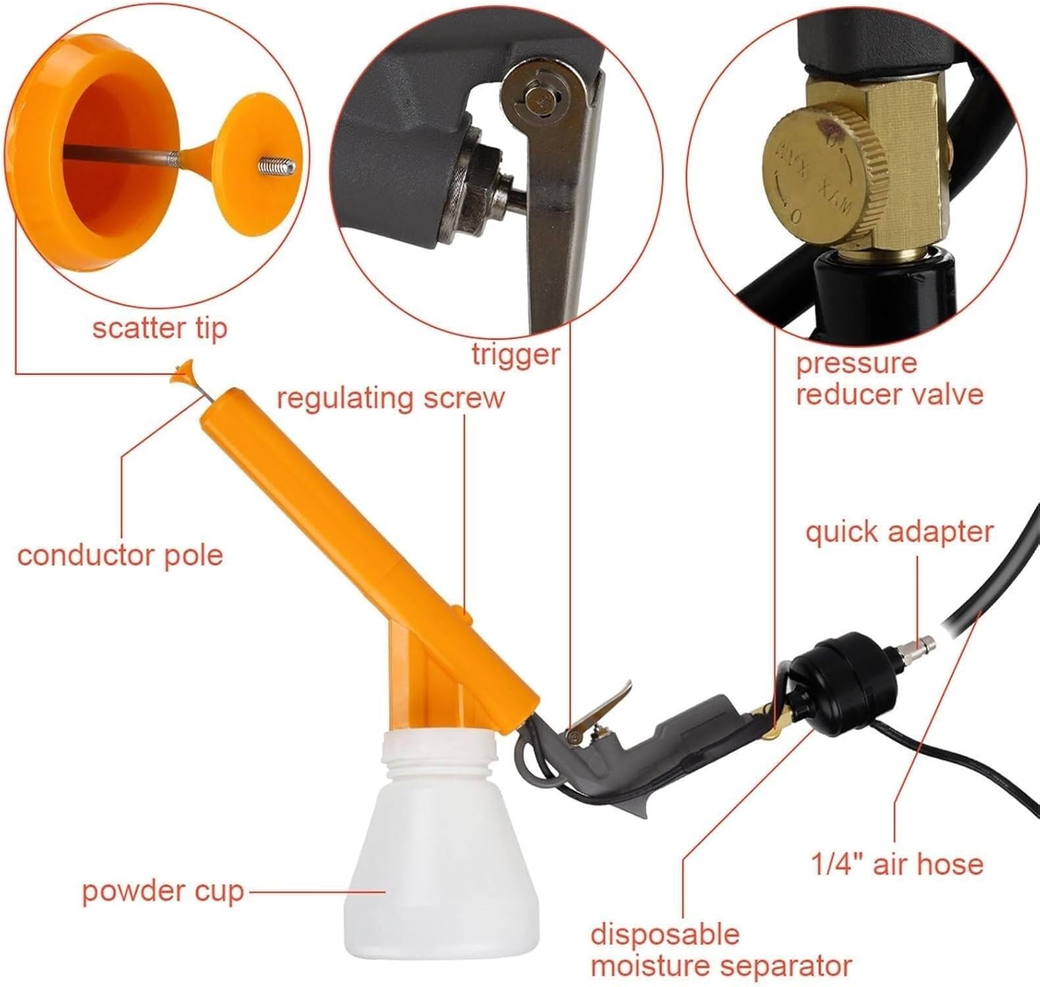 Color: YellowOutput Voltage (Adjustable): 30 KV - 50 KV +- / 5 KV.Air Inlet: 1/4" NPT Thread.Air Source Required: 10-15 PSI.Current: 0.5 AWeight of Complete Set: 6.5 kg