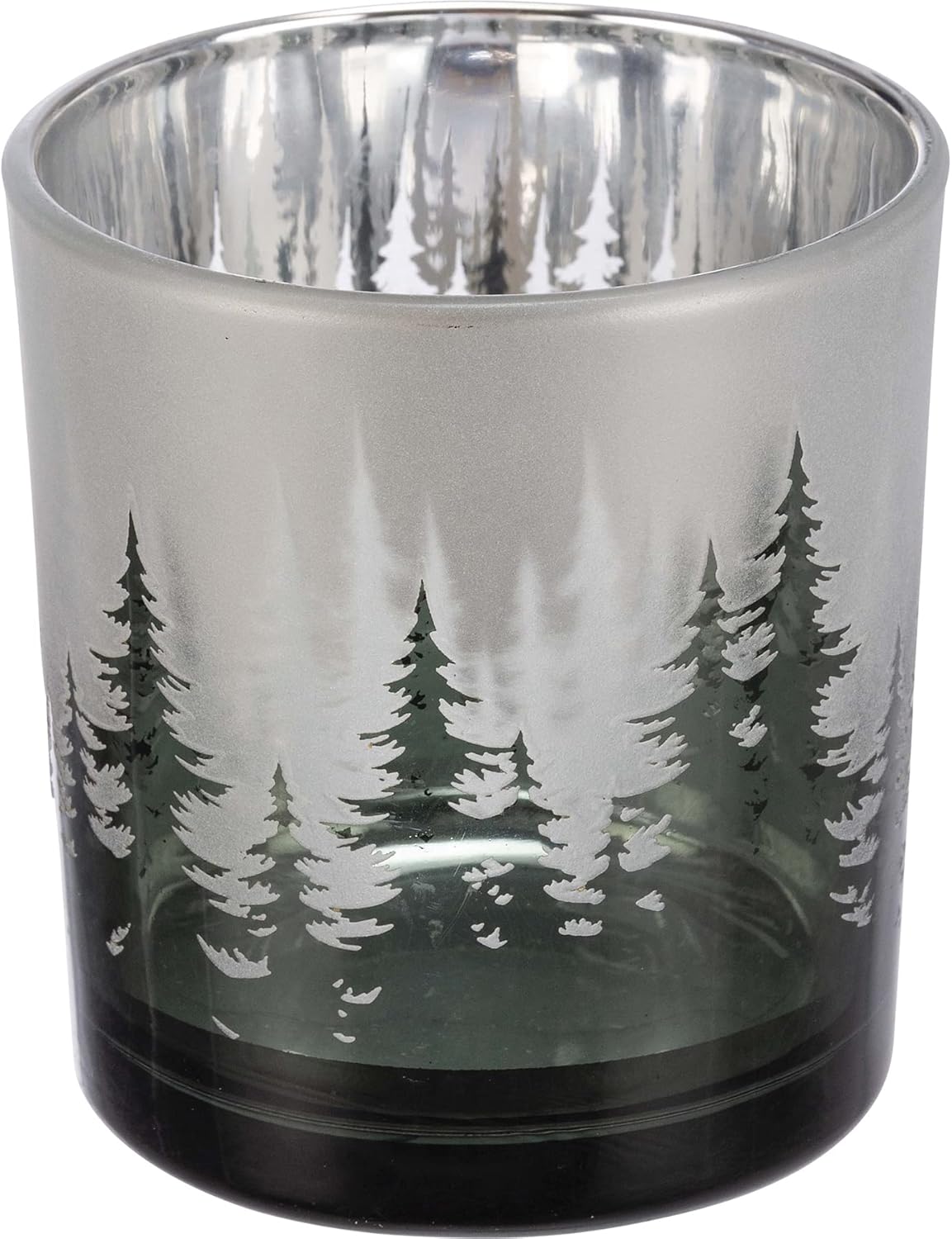 A set of three glass candle holders in varying sizes featuring evergreen tree designs and metallic details to add a charming ambience to any wintry display. Candles not included.