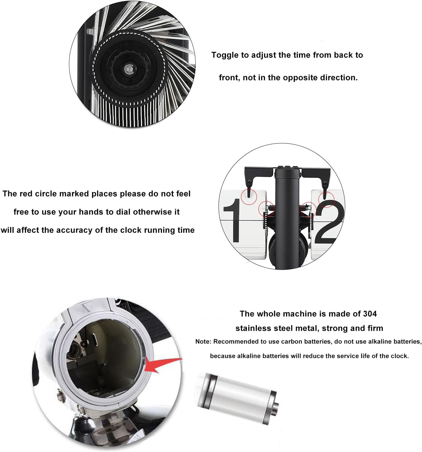 Item Type: Digital Flip ClockMaterial: 304 Stainless Steel, PVC, Black WalnutWeight: Approx. 706g / 24.9ozHeight: 14.3cm / 5.6inBase Size: Approx. 15x8cm / 5.9x3.1inTime: 12 HoursBattery (Excluded): 1 x D Battery, Carbon BatteryWhether Double Sided: Single SidedDisplay Type: NumbersPower Type: BatteryMovement Type: ElectronicSuitable Places: Living Room, Bedroom, Study, Outdoor, Bathroom, Entrance, Balcony, Commercial PlacesPackage List:1 x Flip Clock1 x Instruction ManualNote:1. Carbon batteries are recommended. Battery current output is relatively large, will affect the service life of the product movement and the accuracy of timekeeping, so it is recommended that parents use carbon batteries! (Do not use rechargeable batteries and other current output is relatively large batteries, the use of ordinary batteries)2. Not toggle the hour page, only in the minute page for time adjustment. Note: Adjustment time needs to be adjusted 1 minute before (because the battery is put into a minute before the internal current is fully generated)3. Adjust the time of the toggle, from back to front direction toggle, can not be pulled in the opposite direction.4. The red circle marked place please do not use your hands toggle, otherwise it will affect the accuracy of the clock time;5. As the page is made of soft material, the page may fall off due to the fall and shock during transportation, the page can be uninstalled and installed.