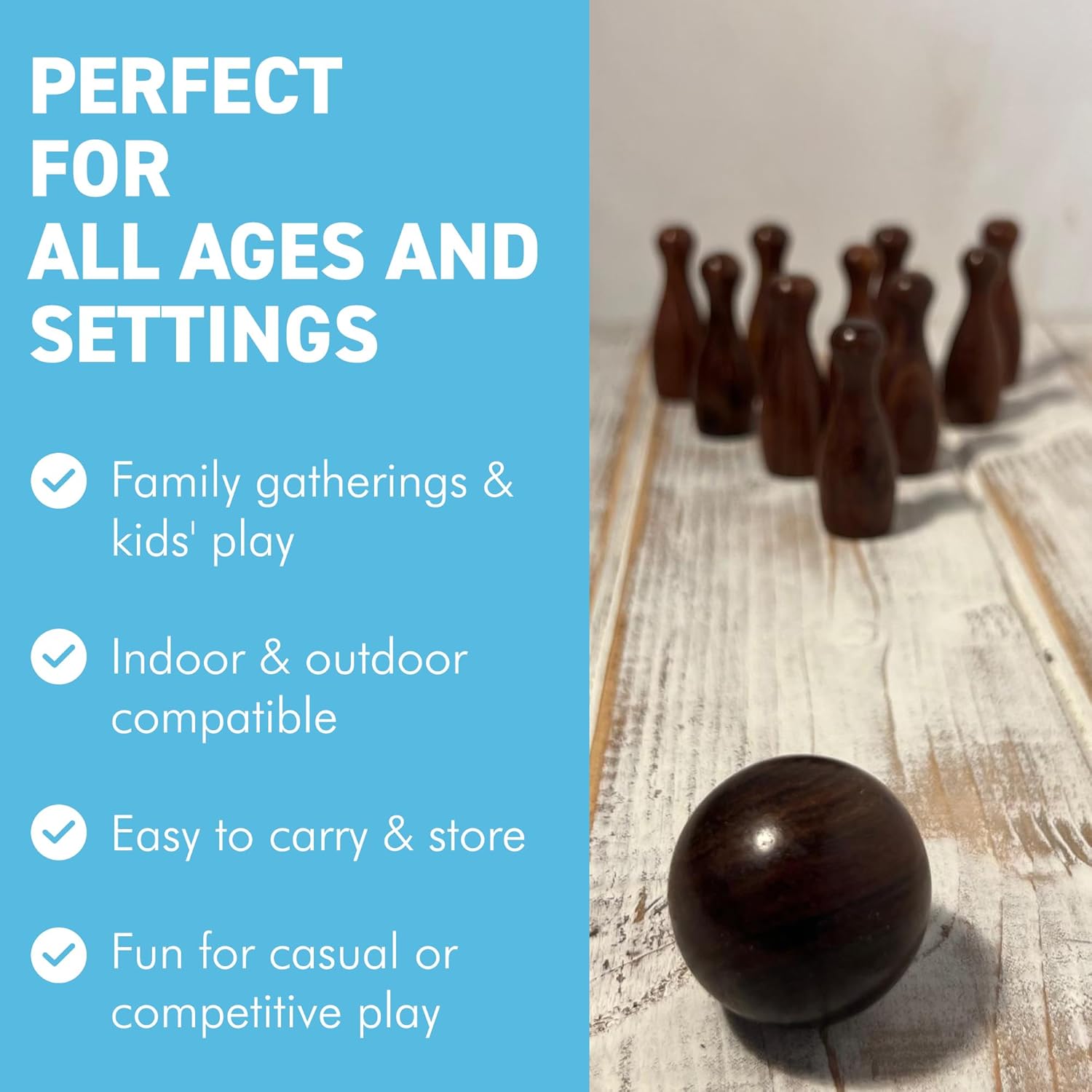 Introducing the Premium Wooden Bowling Set—the perfect blend of classic craftsmanship and modern fun, meticulously designed for enthusiasts of all ages. This wooden bowling game is a timeless addition to any game collection, crafted from high-quality wood to ensure durability and longevity. The solid wood storage box adds an extra layer of elegance and practicality, keeping all components neatly organized while also serving as a beautiful display piece. Whether you're looking for an indoor bowling set to entertain the kids on a rainy day or a family bowling game that everyone can enjoy during gatherings, this set delivers. The smooth, polished wooden pins and ball offer an authentic bowling experience right in the comfort of your home. This classic bowling set is designed to be versatile, making it ideal for both children and adults. It’s a perfect kids bowling set that helps develop coordination and motor skills, while also being engaging enough for adults who appreciate a good, old-fashioned game of bowling. As a wooden sports toy, it stands out for its quality and attention to detail, making it a fantastic choice for those who value craftsmanship. The set makes a premium bowling gift that is sure to impress, whether you're celebrating a birthday, holiday, or just looking for a unique gift idea. The bowling gift for all ages is perfect for anyone who loves games that combine skill, strategy, and a bit of nostalgia. Whether you're setting it up in the living room, on the patio, or in a game room, this set promises hours of entertainment and is a wonderful way to bring people together. Experience the joy of bowling with a set that not only looks great but performs beautifully, offering endless fun and a touch of class to any occasion. Don’t miss out on this premium wooden bowling set—a must-have for game lovers and a delightful addition to any home.