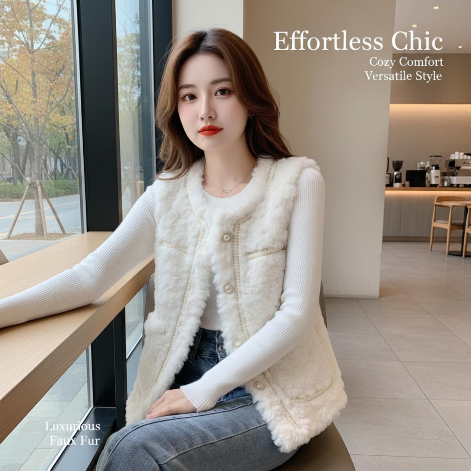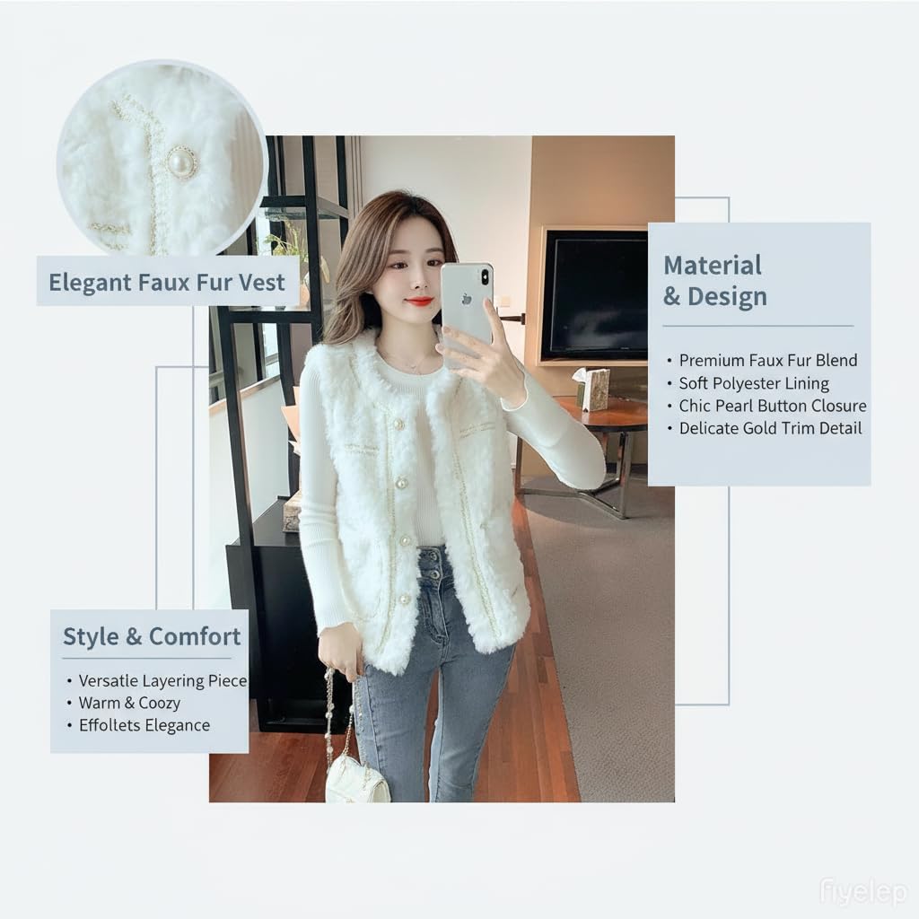 This sophisticated women's faux fur vest brings luxurious texture and timeless elegance to your winter wardrobe. The sleeveless design features a plush, fluffy exterior that adds dimension and visual interest to any outfit, while the pearl button detailing along the front closure provides a refined, polished touch. The classic white color makes this versatile piece easy to layer over long-sleeve knits, blouses, or lightweight sweaters for added warmth without bulk. The structured silhouette with decorative trim creates a flattering shape that works beautifully for both casual and dressy occasions. Multiple functional pockets offer convenient storage for small essentials. Whether you're heading to brunch, running errands, or attending a special event, this fluffy jacket vest elevates your look with its chic, fashion-forward style. The soft faux fur material provides cozy comfort during cooler months while maintaining a lightweight feel that won't weigh you down. Pair it with jeans for a relaxed weekend look or dress it up with tailored trousers for a more sophisticated ensemble.
