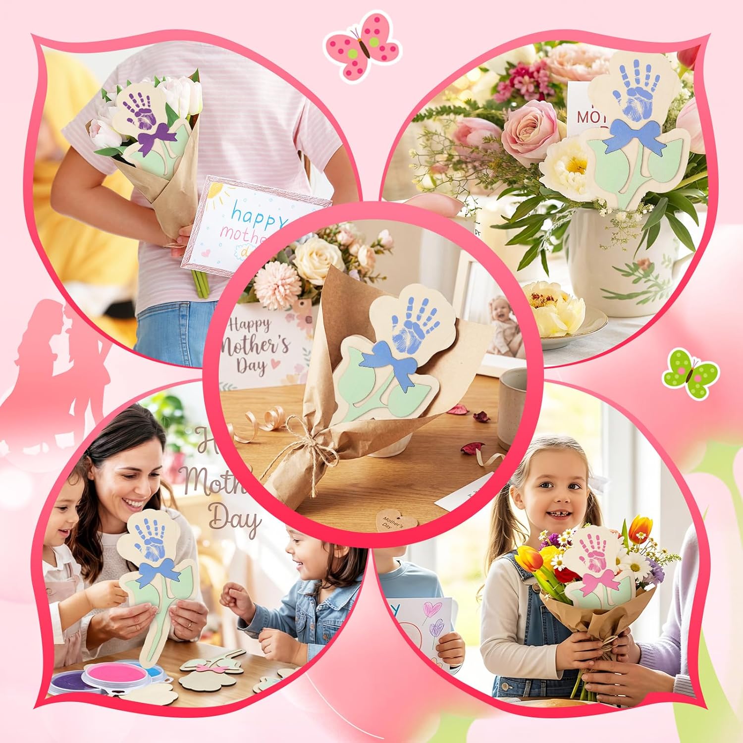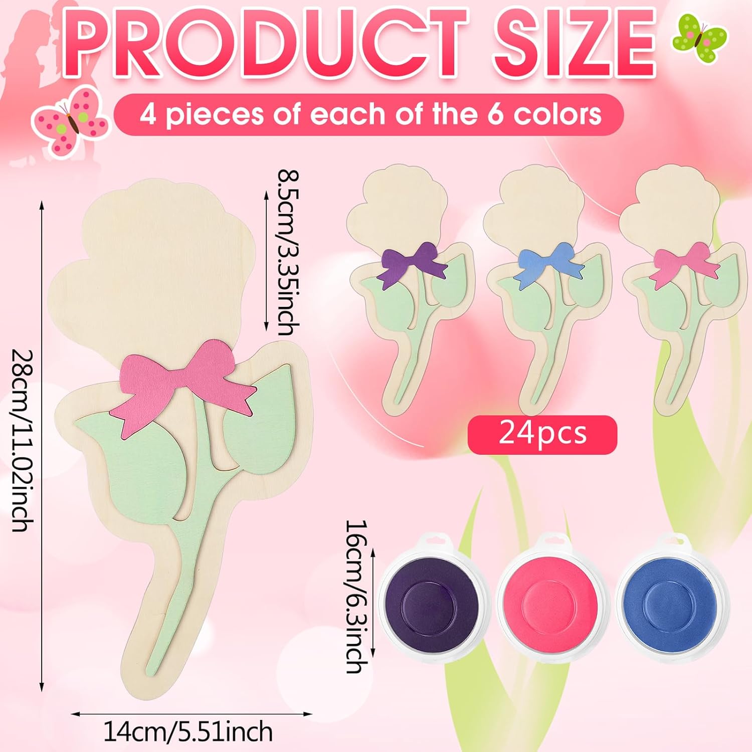 Features: 24 Value Set: includes 24 wood flower-shaped handprint cards, four styles six pieces each. It measures about 11.02 inches in height and 5.51 inches in width, with a roomy handprint area of 3.35 inches high and 4.25 inches wide. Ideal for Mother's Day parties and family gatherings. No extra purchases are needed for group use Premium Smooth Wood Build: Safe & DurableCrafted from high-quality natural wood with a polished burr-free finish. It is non-toxic, odorless, and sturdy enough to hold handprints. It can also serve as a decorative keepsake, with no sharp edges for safe handling Specifications: Material: wooden Color: colorful Size: Handprint: approx. 11.02 inch / 28 cm Package includes: 24 Sets of Mother's Day handprint craft kits 3 x Stamps Notes: Manual measurement, please allow slight errors on size. The color may exist slight difference due to different screen displays. Suitable for people over 14 years old